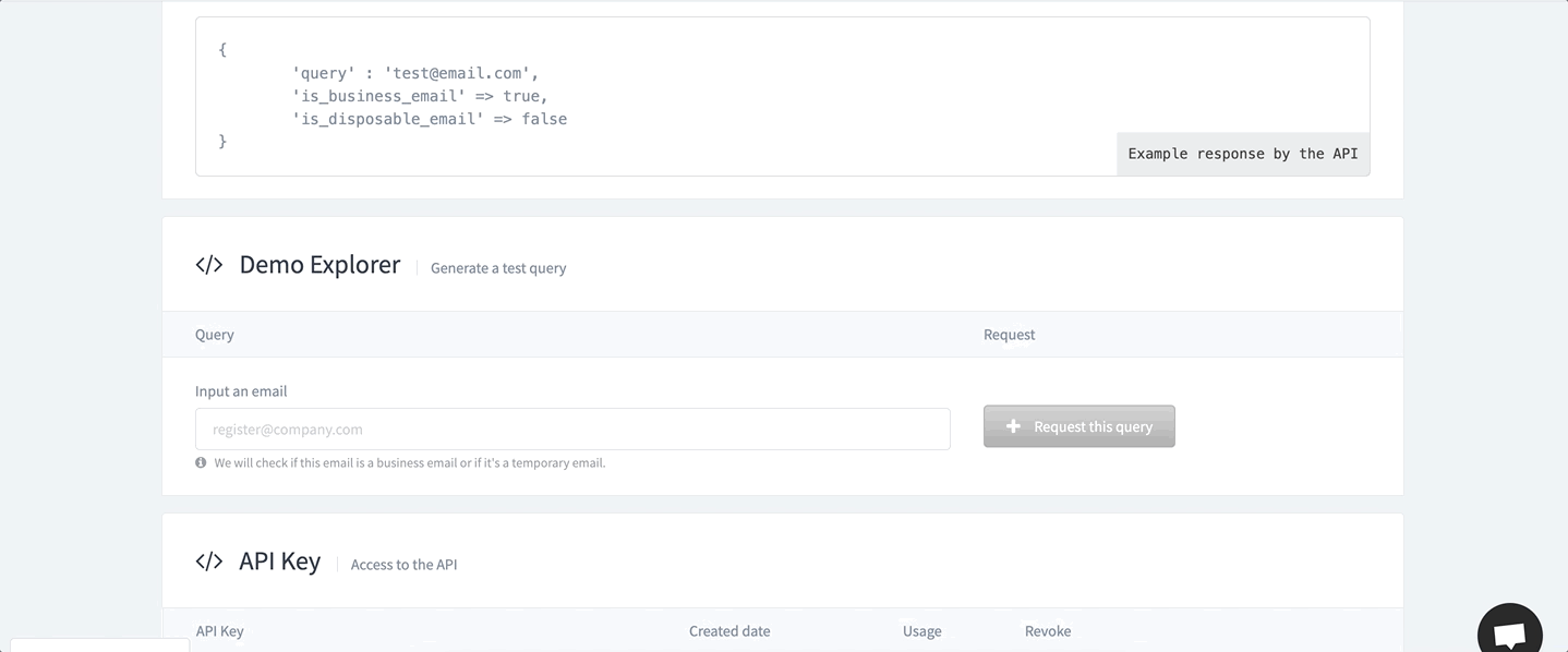 Chaque fois que quelqu'un s'inscrit à votre service, envoyez un ping à cette API pour vérifier si l'e-mail est correct et non un e-mail jetable pour éviter une fausse inscription.